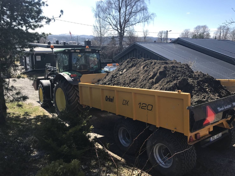 Vi har en traktor som kan utstyres med henger og snøbrøyteutstyr på vinterstid.